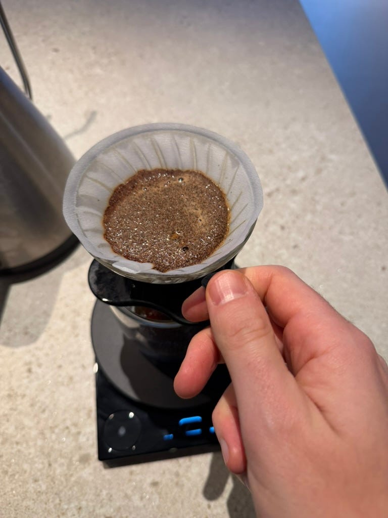 The specific variety of coffee we’re making today is called "v60 pour-over”. Which is ground coffee in a filter on top of a cup, over which you pour boiling water. A bit by bit. It takes about 2-3 minutes to make this (very good) coffee.