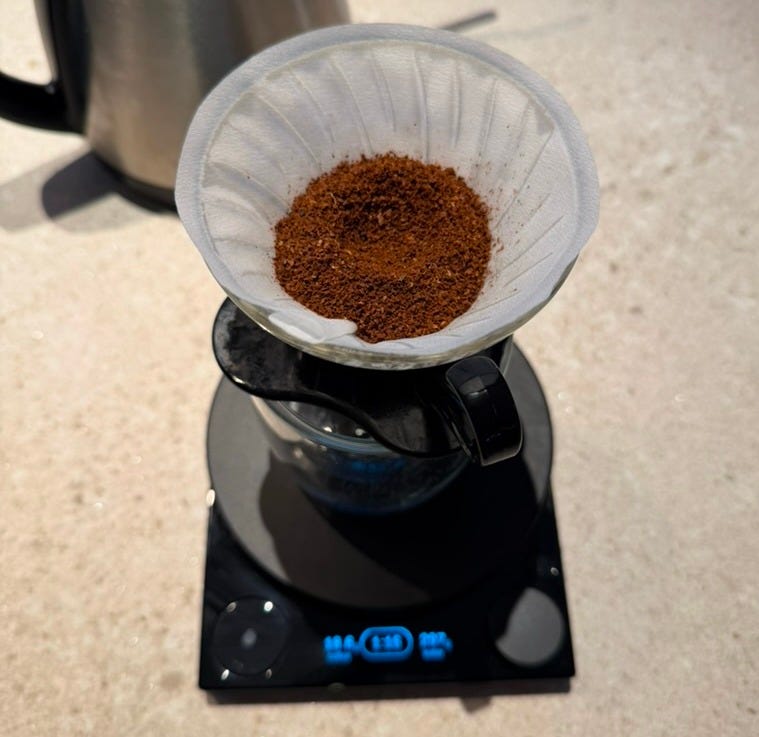 Put the dripper on your cup, and that on the scale. If you have a fancy scale, now is the time to use its functions. If you have a simple one, do nothing with it.