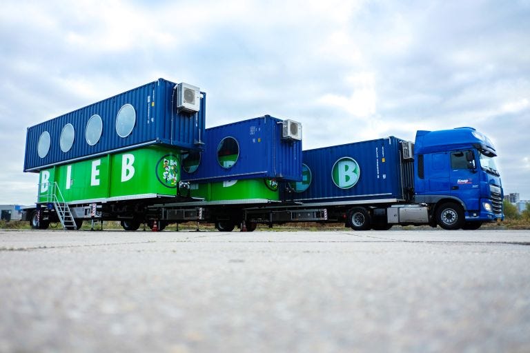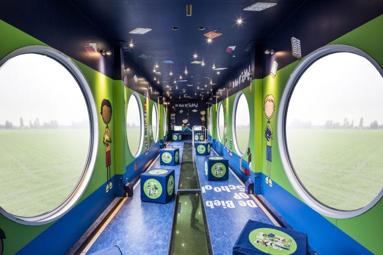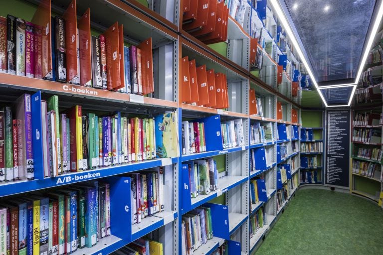 Nearly every week I cycle by the “BiebBus”: a strangely looking container that expands into a two-floor library. Parked nearby schools, the local network of libraries operates three of these to give kids access to over 9000 books.